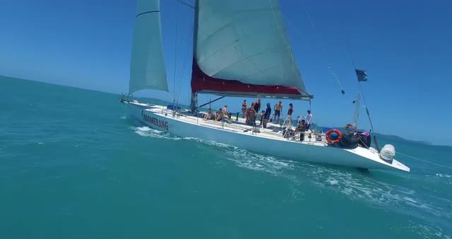 WHITSUNDAY ISLANDS – FEBRUARY 2016 : Aerial shot of sailing boat on a beautiful day with people waving and open ocean in view